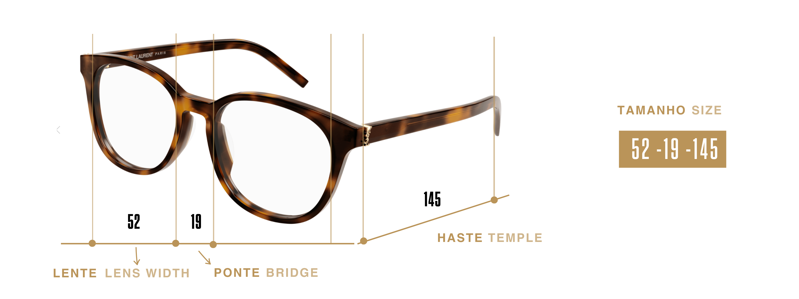 Se já possui uma armação, verifique o tamanho, usualmente gravado na haste. Se vê, por exemplo, "52-19-145", significa que a largura da lente corresponde a 52 milímetros (mm), a ponte (recorte entre as lentes para o encaixe no nariz) é de 19 mm e o comprimento das hastes de 145 mm. Consulte o nosso guia de tamanhos para mais informações.
